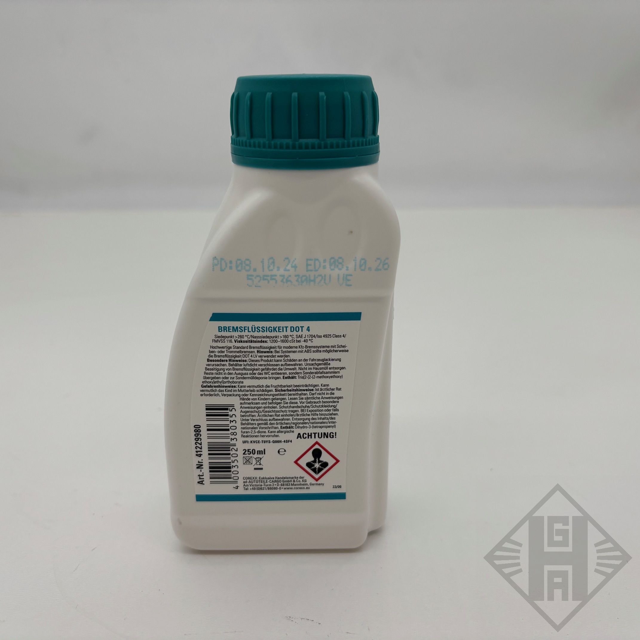 Hierbei handelt es sich um eine 250ml Flasche Bremsflüssigkeit DOT 4. Eine hochwertige Standard Bremsflüssigkeit für moderne Kfz-Bremssysteme mit Scheiben- oder Trommelbremsen. Der Siedepunkt >260°C, Nasssiedepunkt >160°C. Ideal zum Nachfüllen an Trabant 1.1, 601, Barkas B1000, Wartburg 353, DDR Anhänger mit hydraulische Bremse, etc. Bitte beachten Sie die Herstellervorgaben für Ihr Fahrzeug.